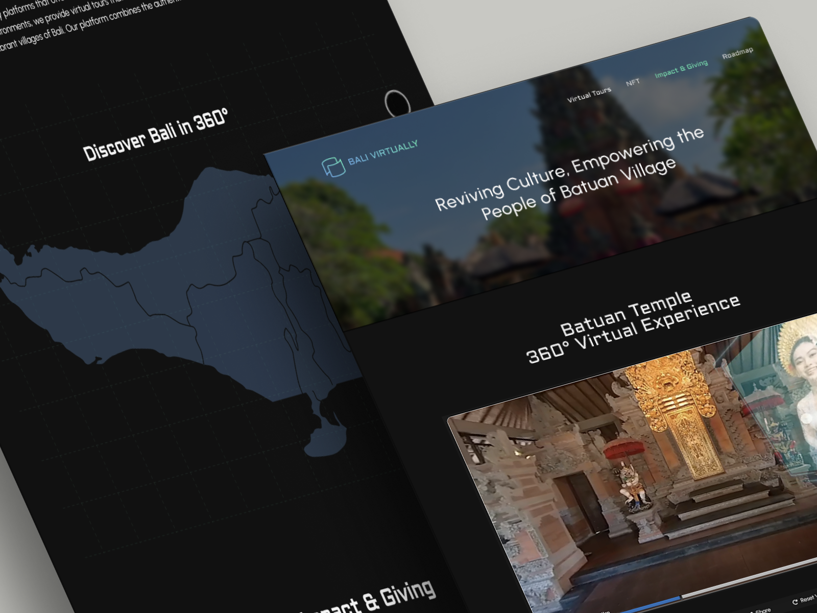 Bali Virtually is a web-based platform where users can explore Bali’s cultural sites through immersive 360° virtual tours. The project also highlights an NFT collection that supports cultural preservation, with 20% of sales pledged for local impact.