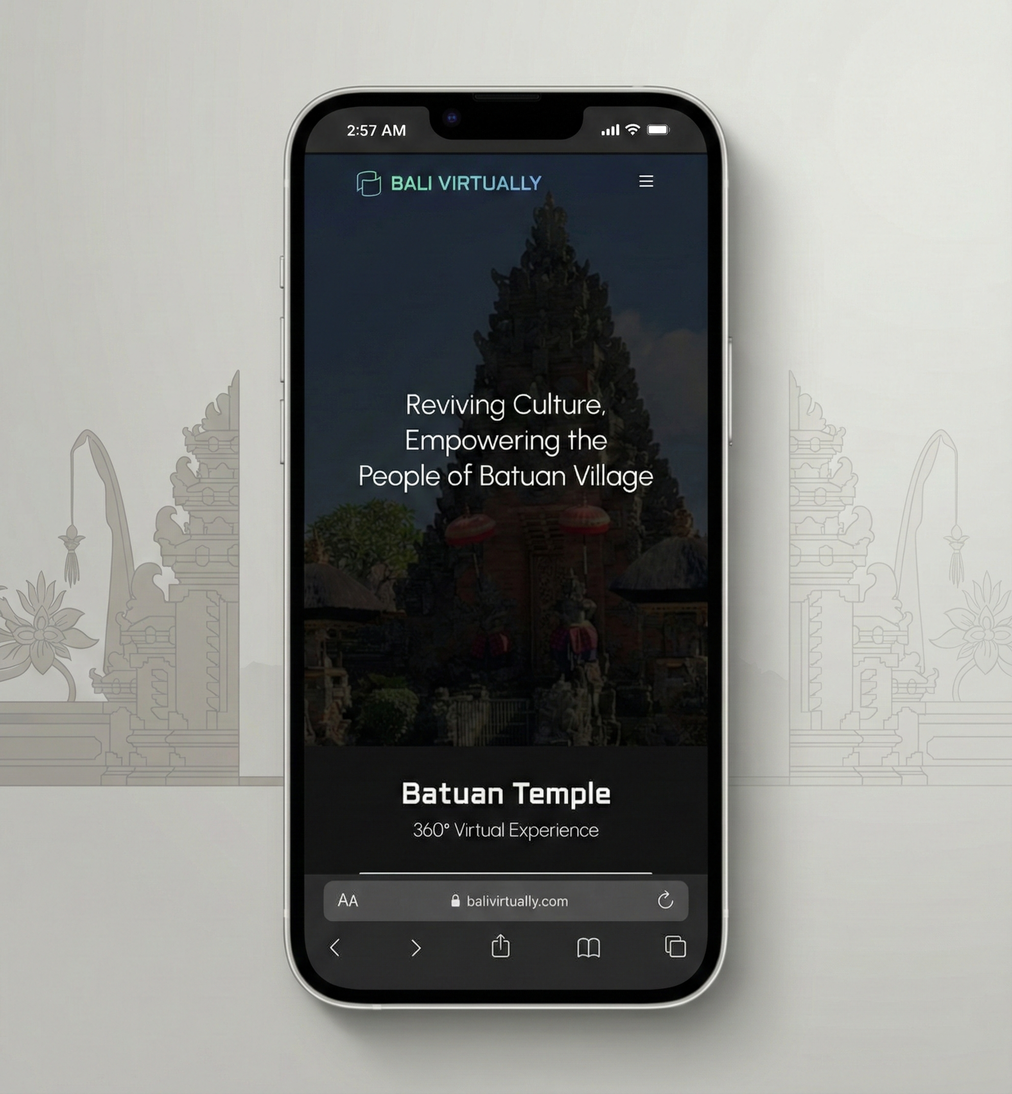 International travelers curious about Bali's temples and cultural sites often rely on generic photos and tourist reviews missing the immersive feel of actually being there. Bali Virtually bridges this gap by offering high-fidelity 360° virtual tours that let users explore sacred sites and hidden locations remotely, bringing Bali's rich heritage to a global audience.